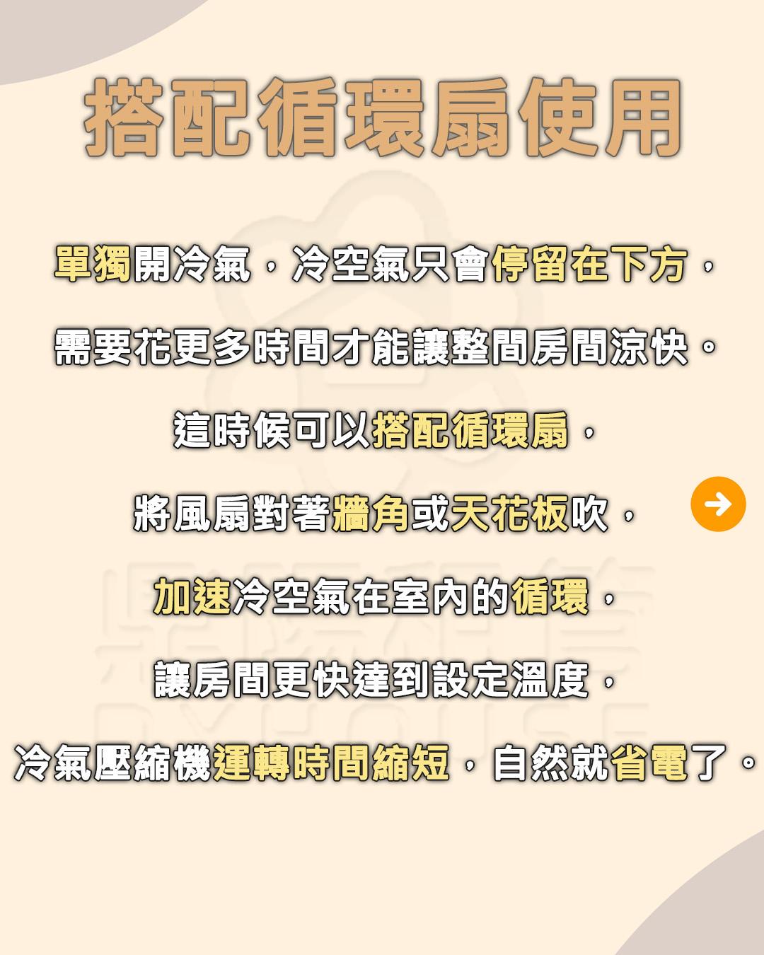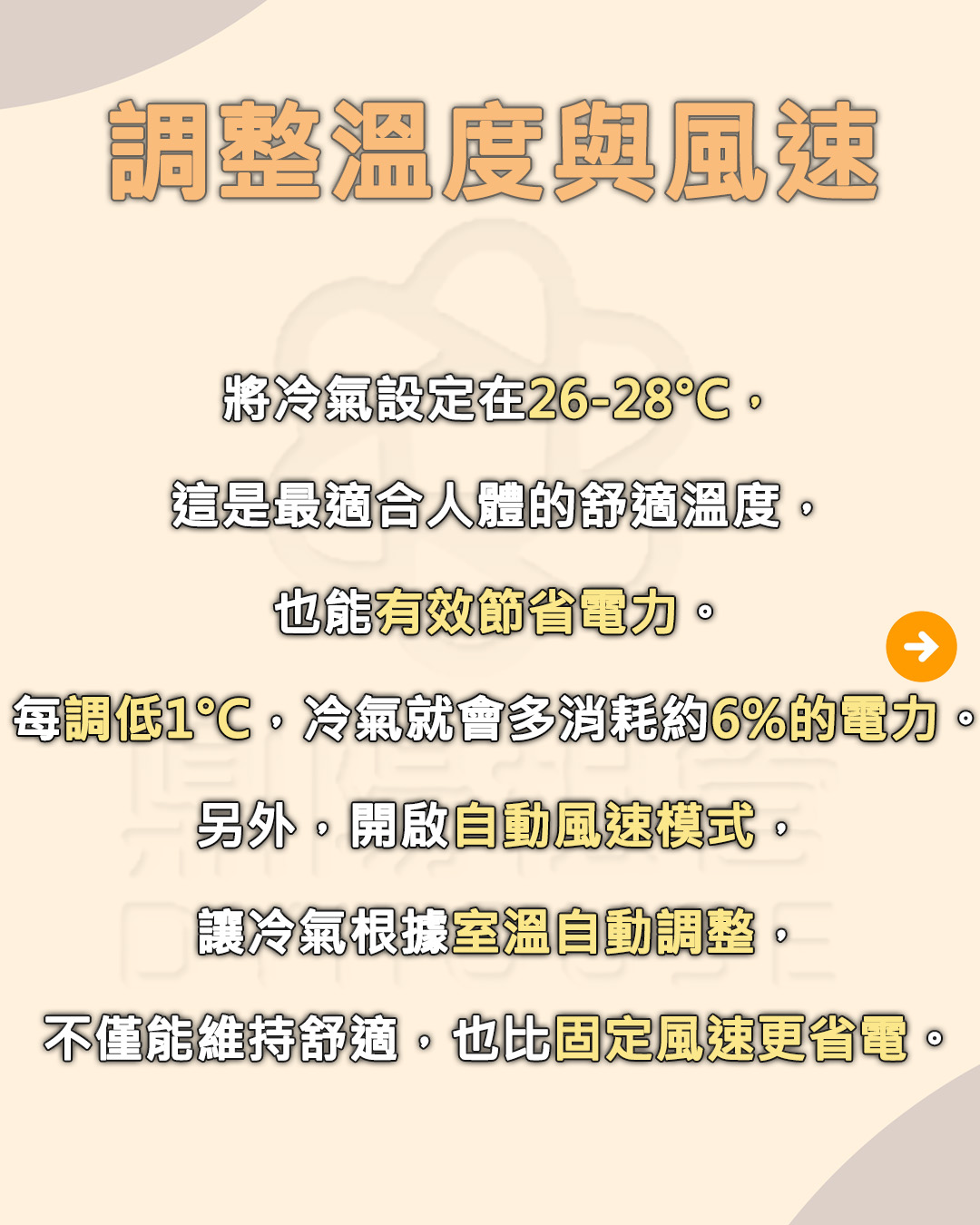 冷氣: 溫度設定在 26-28°C 即可,並搭配電風扇或循環扇使用,能讓冷房效果更好,體感更舒適。